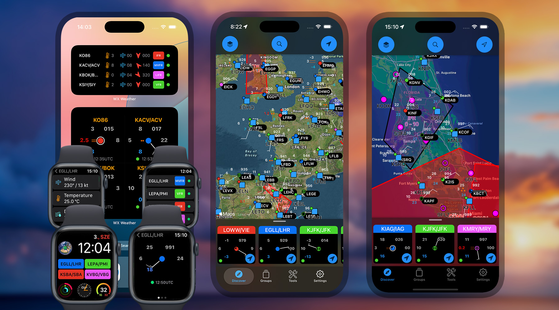 – Weather: METAR trends (last 4 hours), TAF, Runway wind components